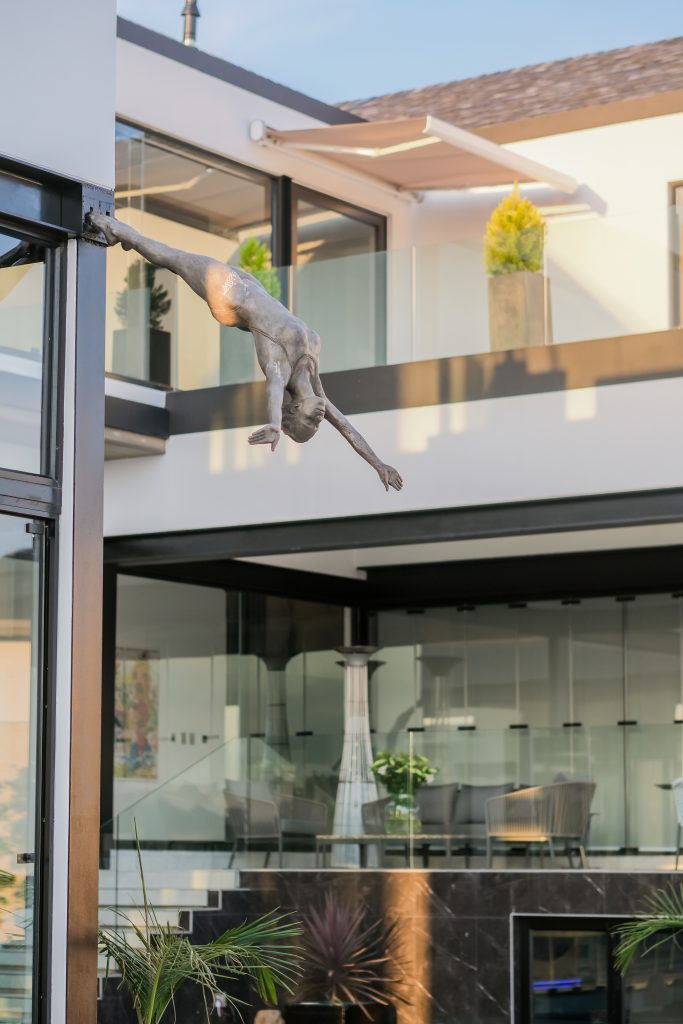 A covered patio and an open patio with a covered option overlook a sunken outdoor boma with a fireplace. The outdoor swimming pool is overlooked by custom-made statues. Maison Benie has been designed and curated so that the entire home enjoys the perfect outdoor and indoor connection.